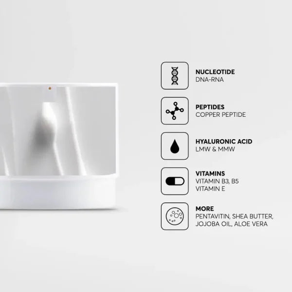 - The synergy of the DNA-RNA complex with the following targeted active ingredients to enhance and improve basic vital functions of the skin and its physiology: